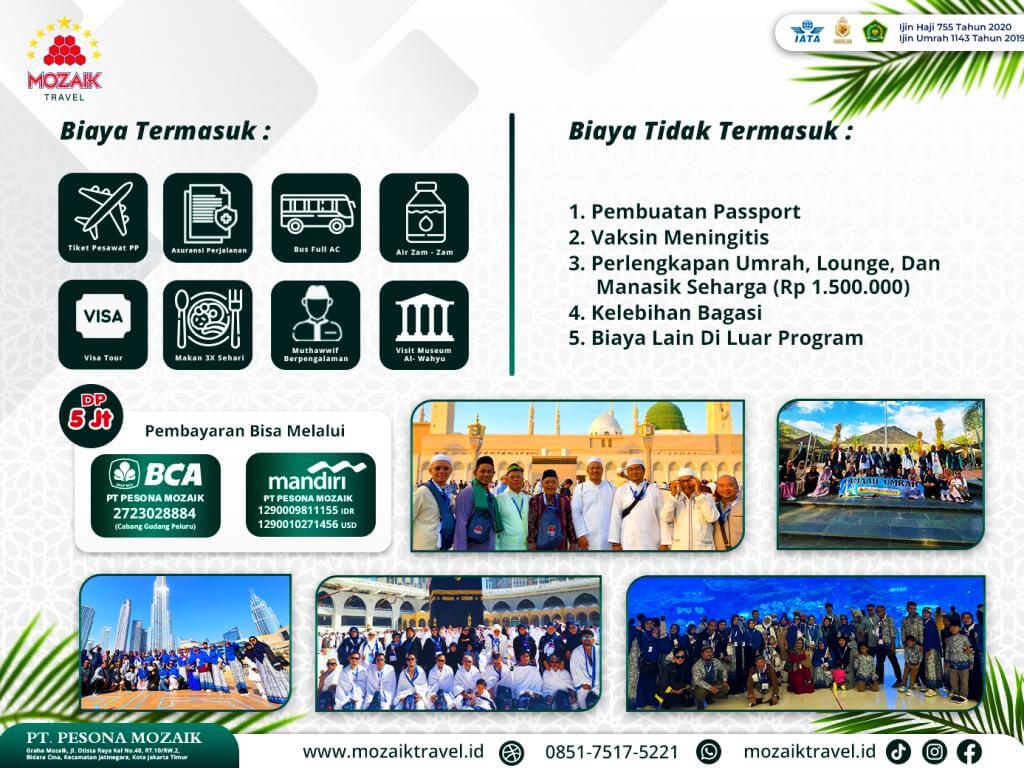 - TIKET PESAWAT EKONOMI PP,MAKAN 3X SEHARI MENU INDONESIA ,AIR ZAM-ZAM 5 LITER ,BUS AC SELAMA PERJALANAN ,VISA UMRAH PLUS VISA TOUR ,MUTHAWWIF YANG BERPENGALAMAN ,ASURANSI PERJALANAN